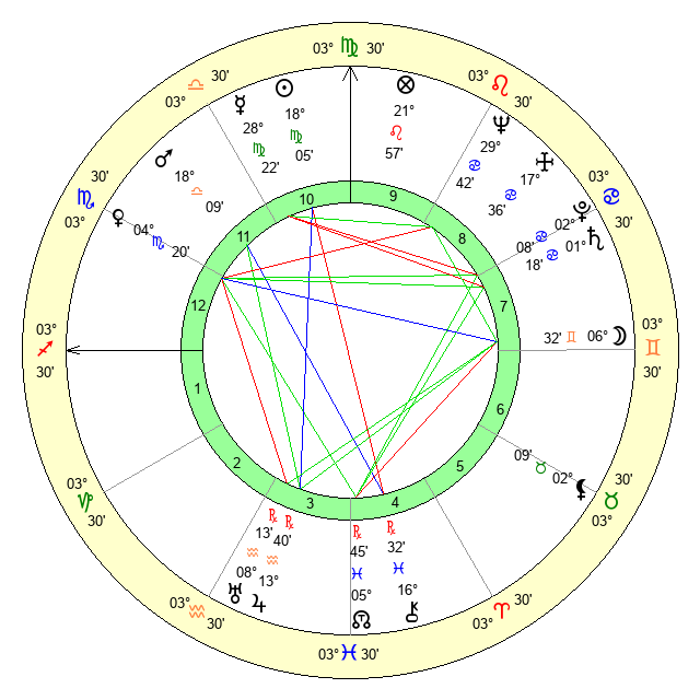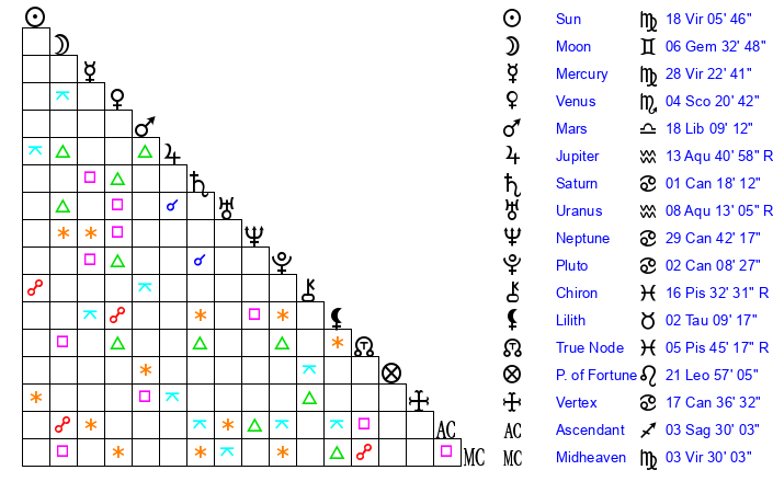 | Sun | 18 Virgo 6 | 19 Virgo 12 | 9 Capricorn 12 |