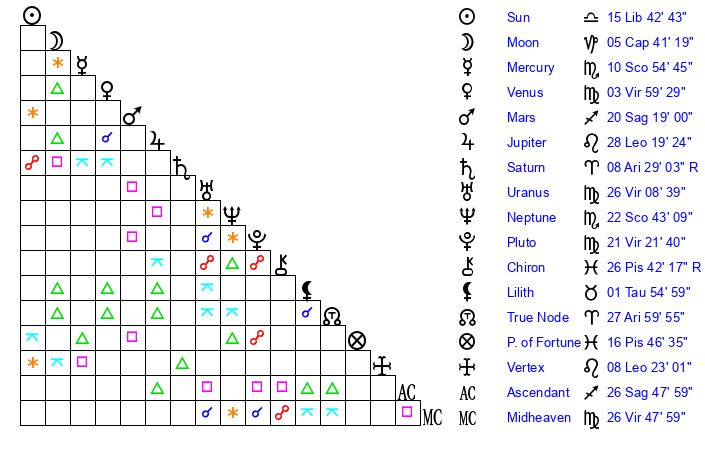 | Sun | 15 Libra 43 | 16 Libra 39 | 13 Sagittarius 53 |