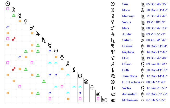 | Pluto | 19 Scorpio 43 | 1 Aquarius 25 | 21 Scorpio 4 |