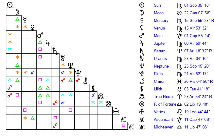 | Neptune | 23 Scorpio 16 | 29 Pisces 54 | 25 Scorpio 22 |
