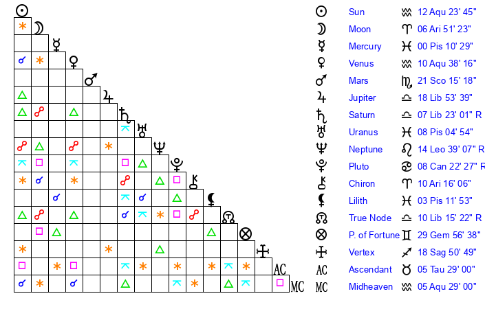 | Moon | 6 Aries 50 | 29 Pisces 29 | 23 Capricorn 40 |