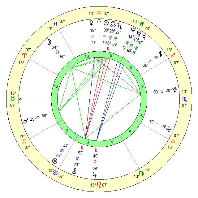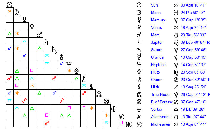 Venus | 19 Aquarius 27 | 17 Pisces 41 | 1 Aries 41 |