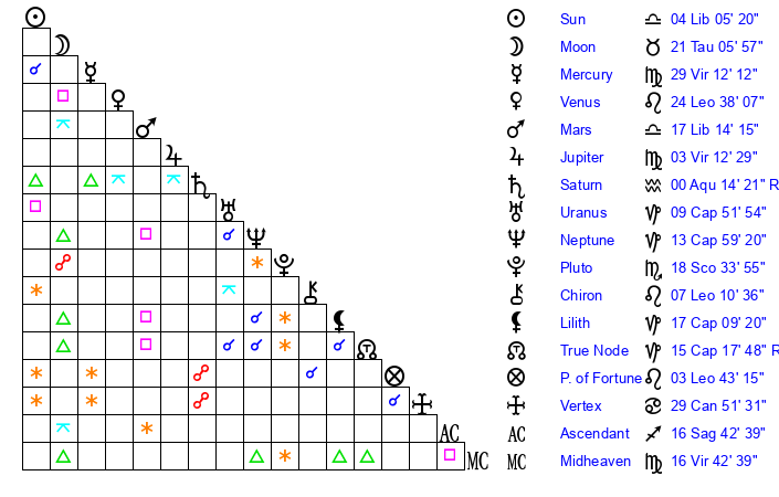 | Moon | 20 Taurus 59 | 9 Sagittarius 37 | 25 Leo 57 |