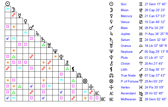 | Sun | 27 Gemini 17 | 27 Gemini 42 | 16 Leo 56 |