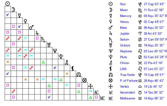 | Sun | 27 Capricorn 2 | 27 Capricorn 50 | 14 Taurus 36 |