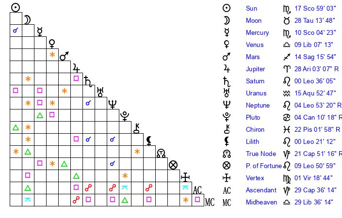 | Neptune | 4 Leo 54 | 29 Pisces 36 | 2 Leo 36 |
