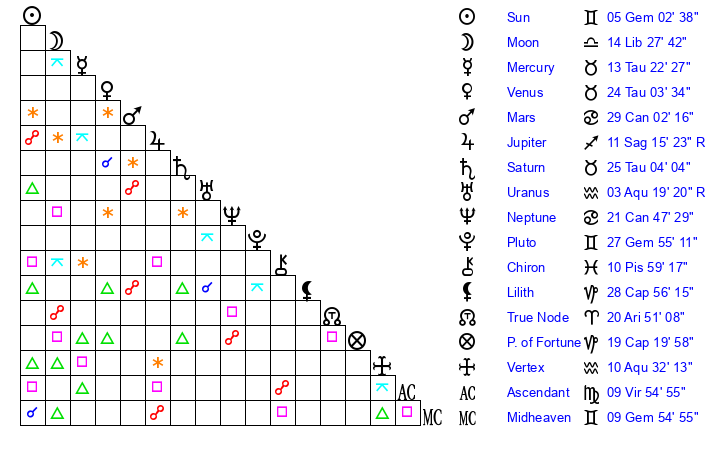 | Pluto | 27 Gemini 55 | 3 Aquarius 42 | 0 Cancer 2 |