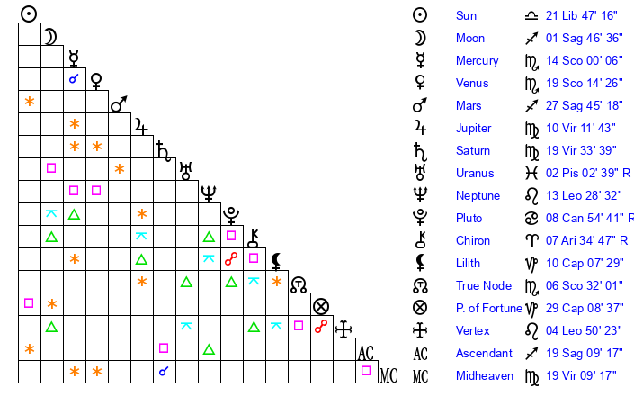 | Saturn | 12 Virgo 20 | 14 Pisces 29 | 5 Virgo 58 |