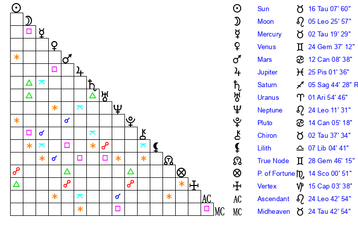 | Sun | 16 Taurus 8 | 17 Taurus 23 | 19 Leo 56 |