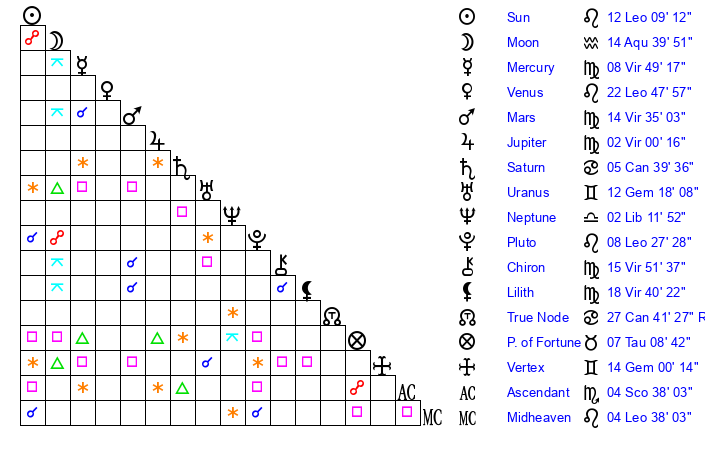 | Pluto | 8 Leo 27 | 2 Aquarius 20 | 10 Leo 11 |