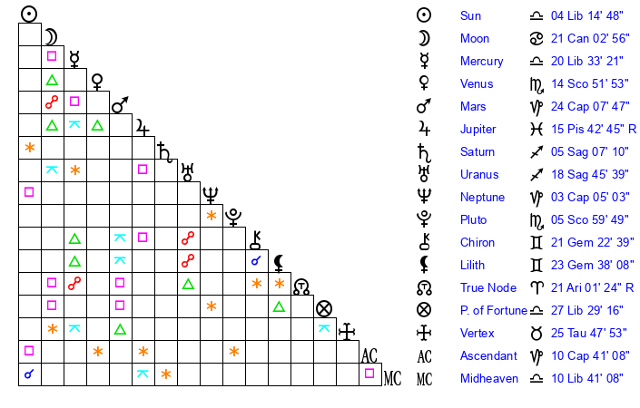 Sun | 4 Libra 15 | 4 Libra 48 | 12 Scorpio 56 |