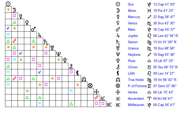 | Sun | 12 Capricorn 41 | 13 Capricorn 32 | 29 Aquarius 24 |