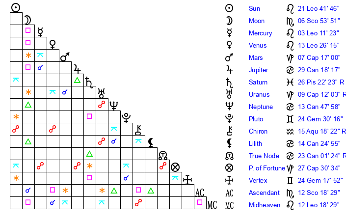 | Sun | 21 Leo 42 | 23 Leo 7 | 18 Sagittarius 31 |