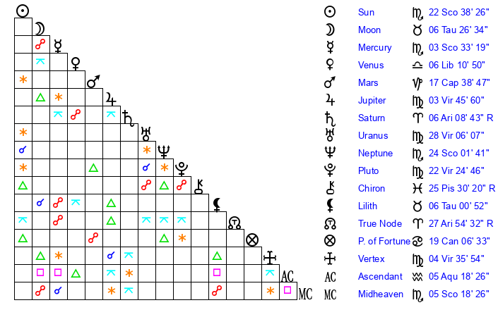 | Sun | 22 Scorpio 38 | 23 Scorpio 35 | 21 Capricorn 34 |