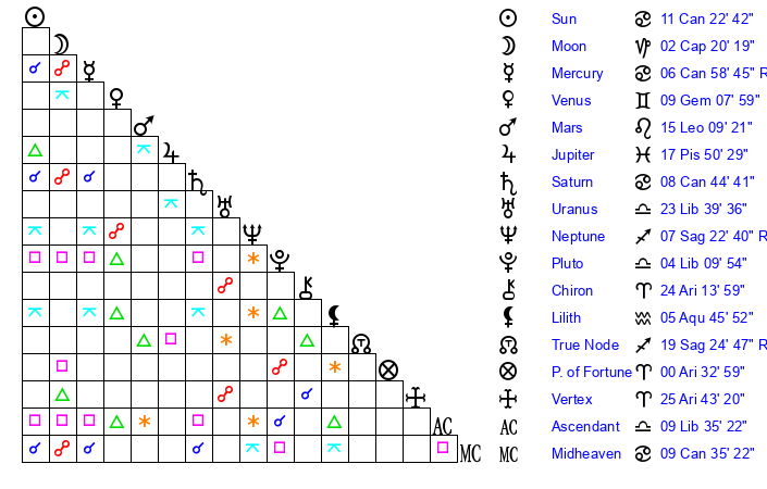 | Sun | 11 Cancer 22 | 12 Cancer 1 | 0 Virgo 10 |