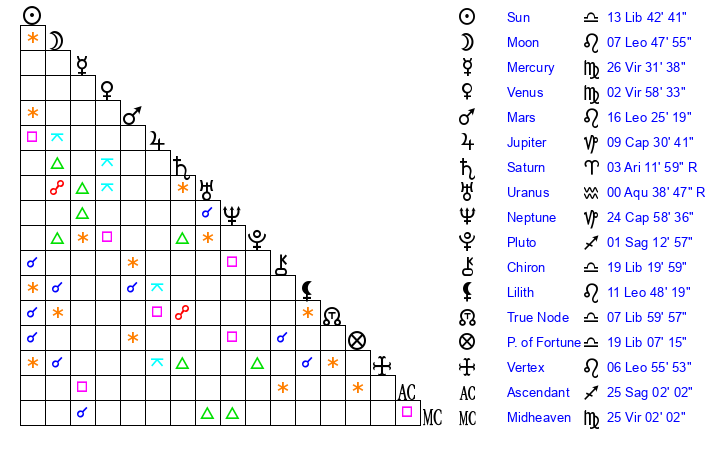| Mars | 16 Leo 25 | 9 Scorpio 46 | 2 Virgo 58 |
