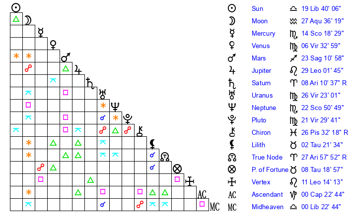| Moon | 27 Aquarius 38 | 19 Cancer 52 | 9 Aries 39 |