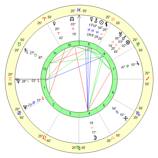 | Sun | 4 Pisces 30 | 5 Pisces 20 | 23 Gemini 57 |