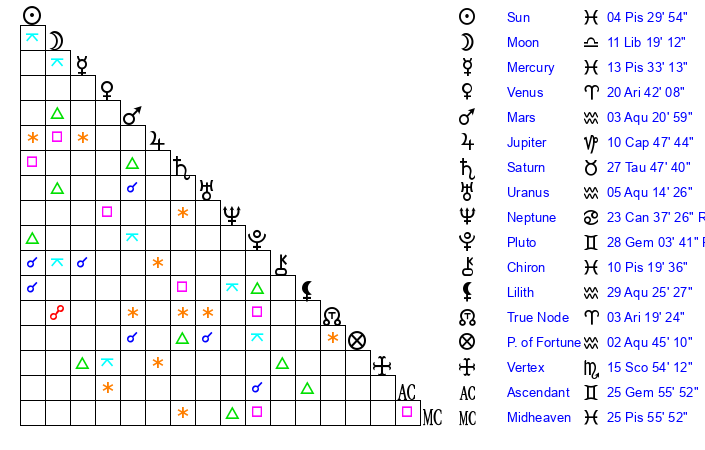 | Sun | 4 Pisces 30 | 5 Pisces 20 | 23 Gemini 57 |