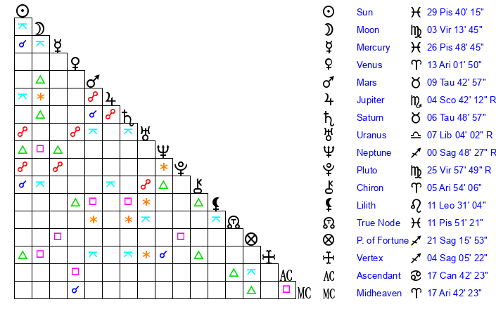 | Moon | 3 Virgo 14 | 10 Sagittarius 10 | 7 Virgo 14 |