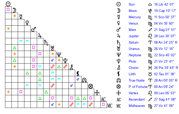 | Sun | 16 Libra 42 | 17 Libra 38 | 14 Sagittarius 54 |