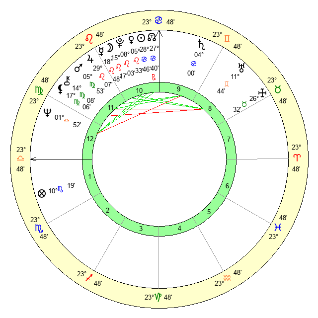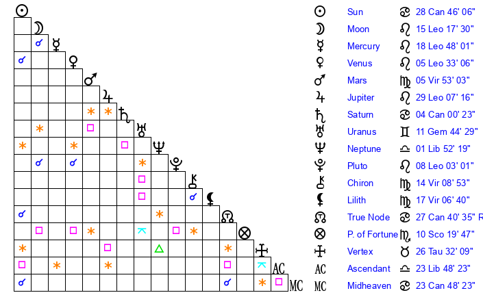 | Sun | 28 Cancer 46 | 29 Cancer 11 | 17 Libra 16 |