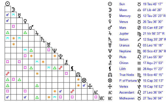 | Mercury | 12 Taurus 25 | 0 Taurus 20 | 9 Leo 25 |