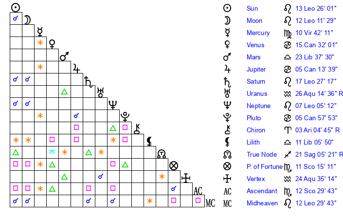 | Neptune | 7 Leo 5 | 1 Aries 53 | 9 Leo 18 |