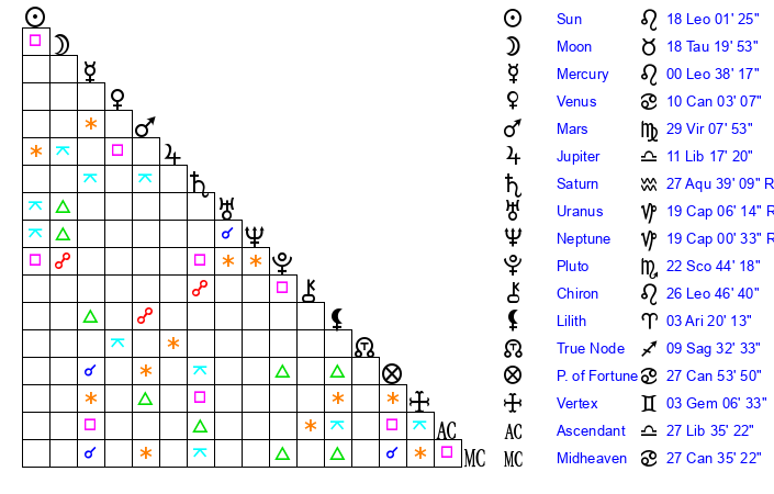 | Moon | 18 Taurus 13 | 5 Pisces 15 | 17 Cancer 51 |