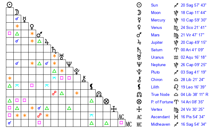| Sun | 20 Sagittarius 58 | 20 Sagittarius 55 | 20 Capricorn 30 |