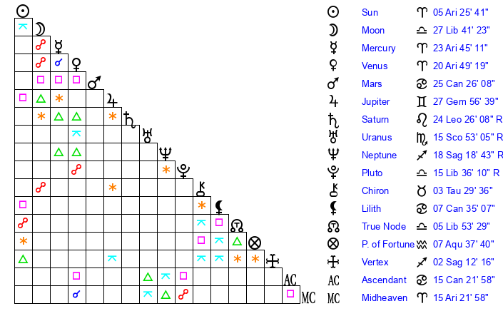 Moon | 27 Libra 44 | 24 Aquarius 56 | 19 Cancer 55 |