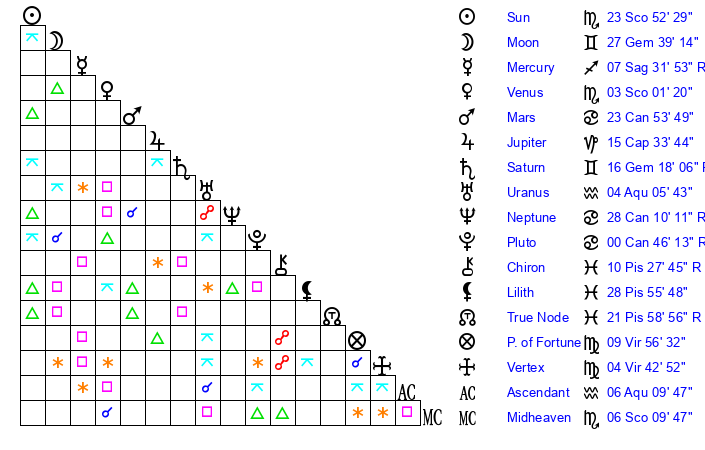 Pluto | 0 Cancer 46 | 29 Capricorn 56 | 29 Gemini 4 |