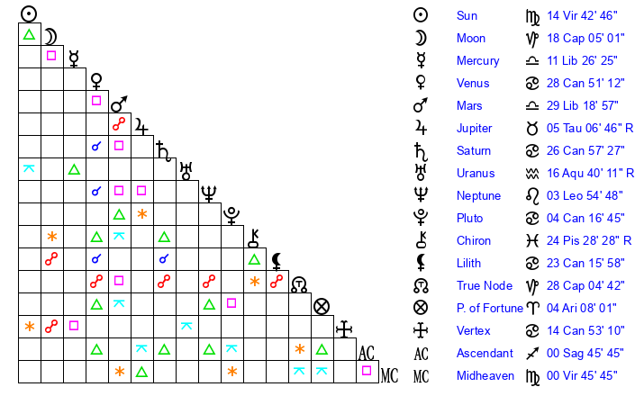 | Sun | 14 Virgo 42 | 15 Virgo 19 | 3 Capricorn 36 |