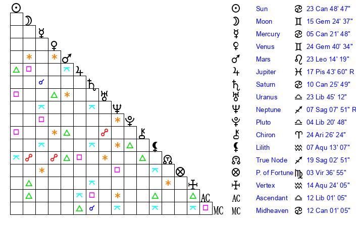 Venus | 24 Gemini 40 | 13 Gemini 31 | 26 Leo 41 |