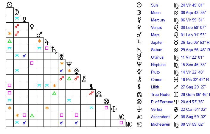 | Pluto | 14 Virgo 23 | 1 Aquarius 31 | 16 Virgo 5 |