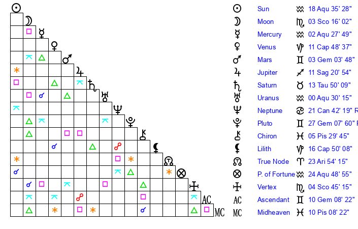 | Sun | 18 Aquarius 35 | 20 Aquarius 11 | 9 Gemini 50 |