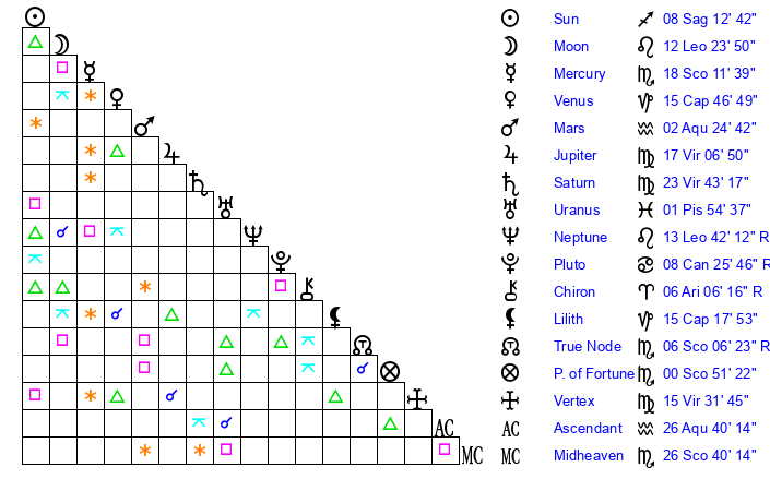 | Saturn | 24 Virgo 23 | 25 Pisces 4 | 21 Virgo 56 |