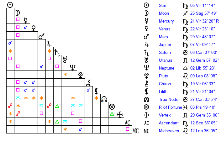 Mercury | 21 Virgo 32 | 21 Leo 4 | 10 Sagittarius 50 |