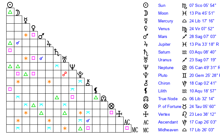 | Moon | 13 Pisces 51 | 2 Pisces 57 | 5 Virgo 0 |