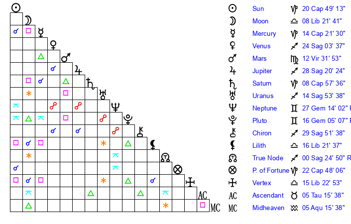 | Moon | 8 Libra 22 | 23 Gemini 27 | 18 Aries 38 |