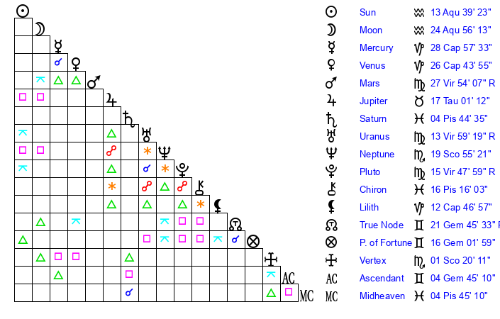 | Pluto | 15 Virgo 48 | 2 Aquarius 6 | 14 Virgo 18 |