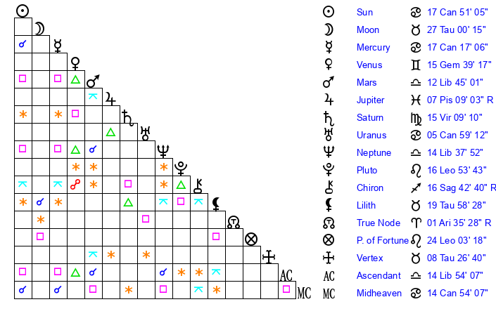 | Sun | 17 Cancer 51 | 18 Cancer 41 | 0 Libra 5 |