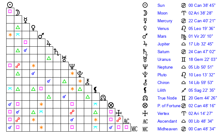 Sun | 0 Cancer 39 | 1 Cancer 31 | 16 Virgo 24 |