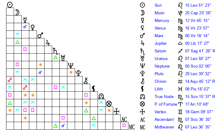 | Pluto | 29 Leo 39 | 2 Aquarius 14 | 1 Virgo 43 |
