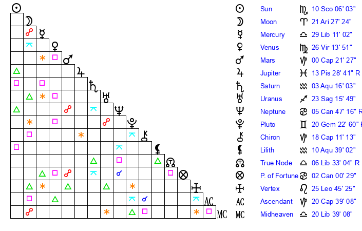 | Moon | 21 Aries 31 | 15 Aries 29 | 19 Libra 35 |