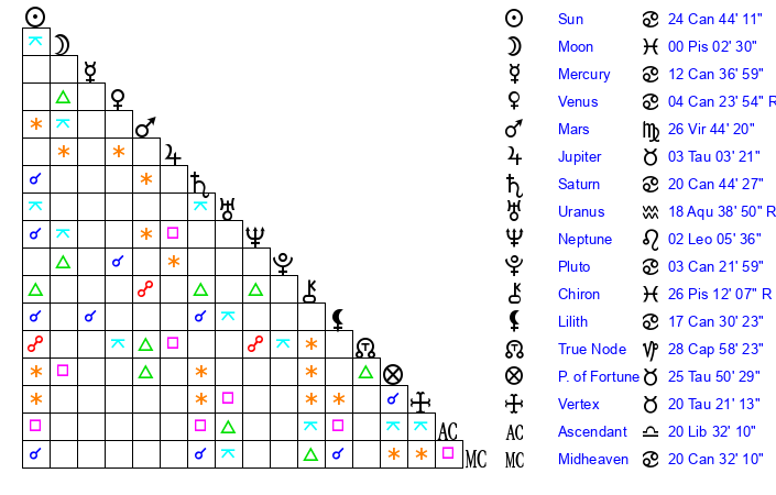 | Venus | 4 Cancer 23 | 14 Gemini 36 | 0 Libra 47 |