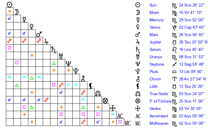 | Sun | 24 Scorpio 28 | 24 Scorpio 35 | 14 Capricorn 14 |