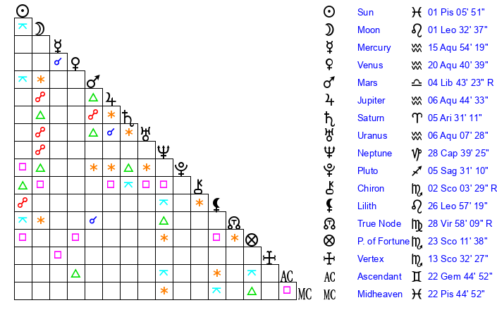 | Venus | 20 Aquarius 41 | 8 Aries 50 | 25 Pisces 37 |