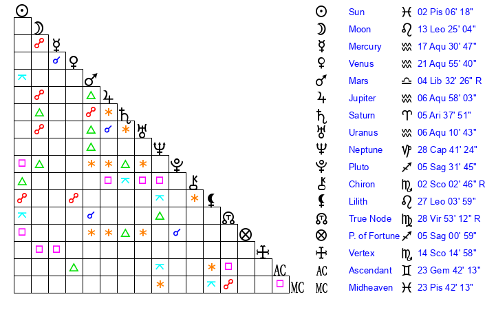 | Venus | 21 Aquarius 56 | 9 Aries 11 | 26 Pisces 52 |