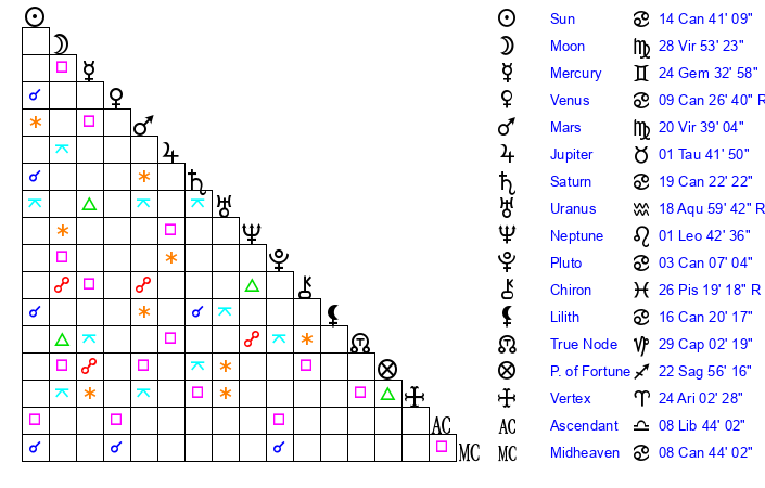 | Neptune | 1 Leo 52 | 27 Pisces 17 | 29 Cancer 54 |